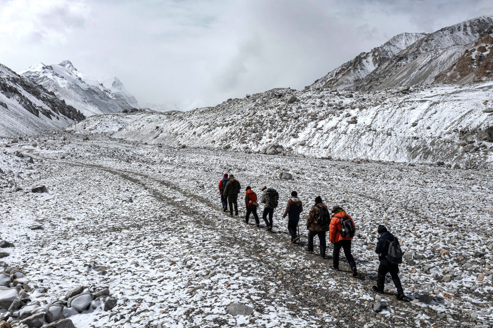 ↑冰川与污染物科考小组在徒步前往东绒布冰川区域(5月1日摄,无人机照片)。新华社记者 孙非 摄