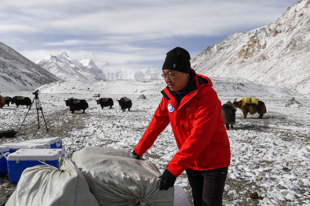 ↑冰川与污染物科考小组负责人康世昌在检查上山物资(5月1日摄)。新华社记者 姜帆 摄
