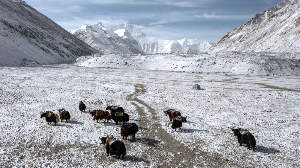 ↑在珠峰登山大本营,牦牛工在搬运准备运送上山的物资(5月1日摄)。新华社记者 姜帆 摄