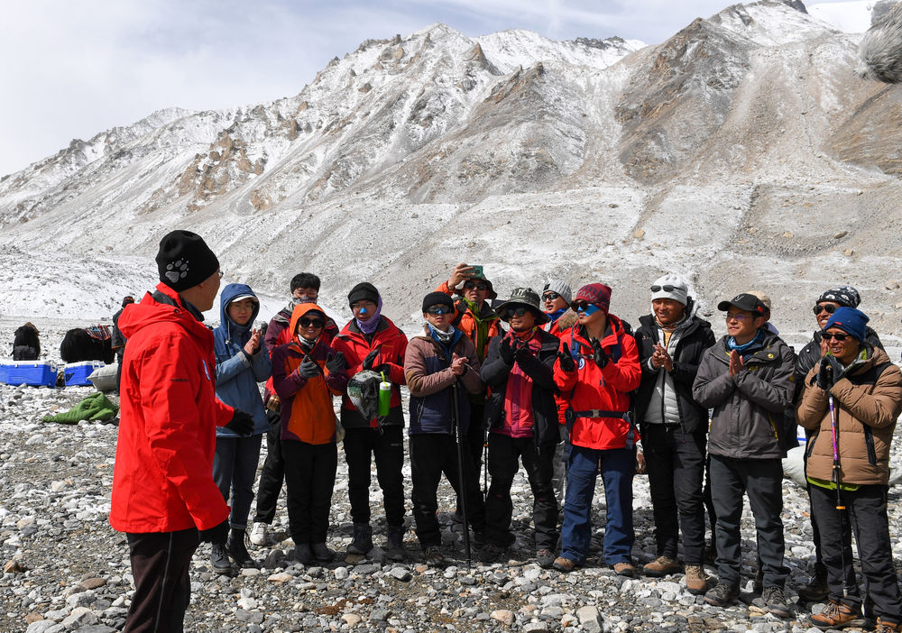 ↑在珠峰登山大本营,冰川与污染物科考小组负责人康世昌(左一)在做行前动员(5月1日摄)。新华社记者 姜帆 摄
