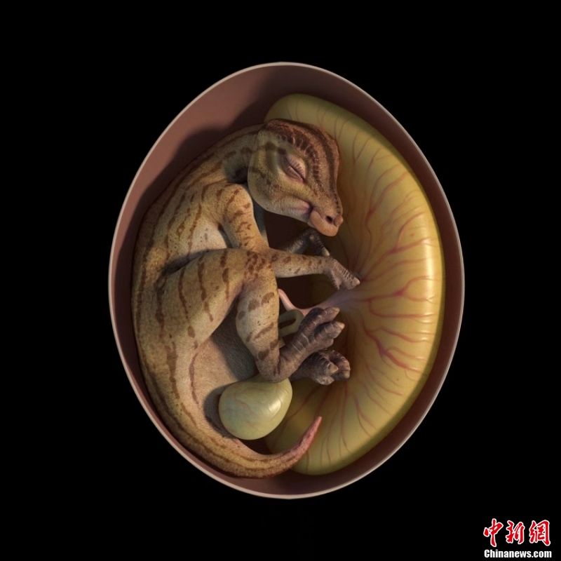 5月11日,福建省英良石材自然历史博物馆对外发布,科学家在对一批恐龙蛋化石标本进行详细研究时,发现了迄今为止科学记录最完整的鸭嘴龙类胚胎化石,博物馆将其称为“英贝贝(Ying Baby)”。图为“英贝贝(Ying Baby)”3D复原图。