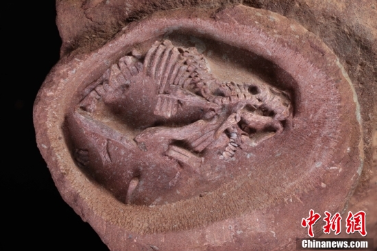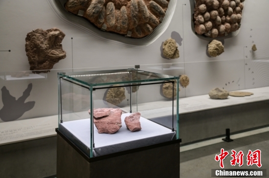 5月11日,福建省英良石材自然历史博物馆对外发布,科学家在对一批恐龙蛋化石标本进行详细研究时,发现了迄今为止科学记录最完整的鸭嘴龙类胚胎化石,博物馆将其称为“英贝贝(Ying Baby)”。图为5月9日,馆内展示鸭嘴龙类胚胎化石。(中新社发 英良石材自然历史博物馆 供图)