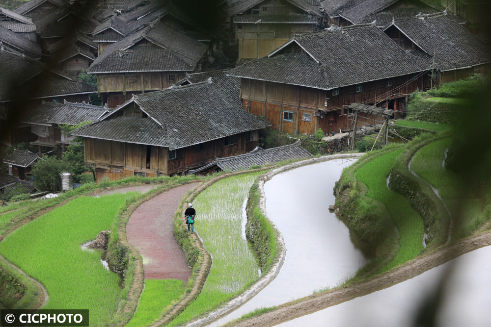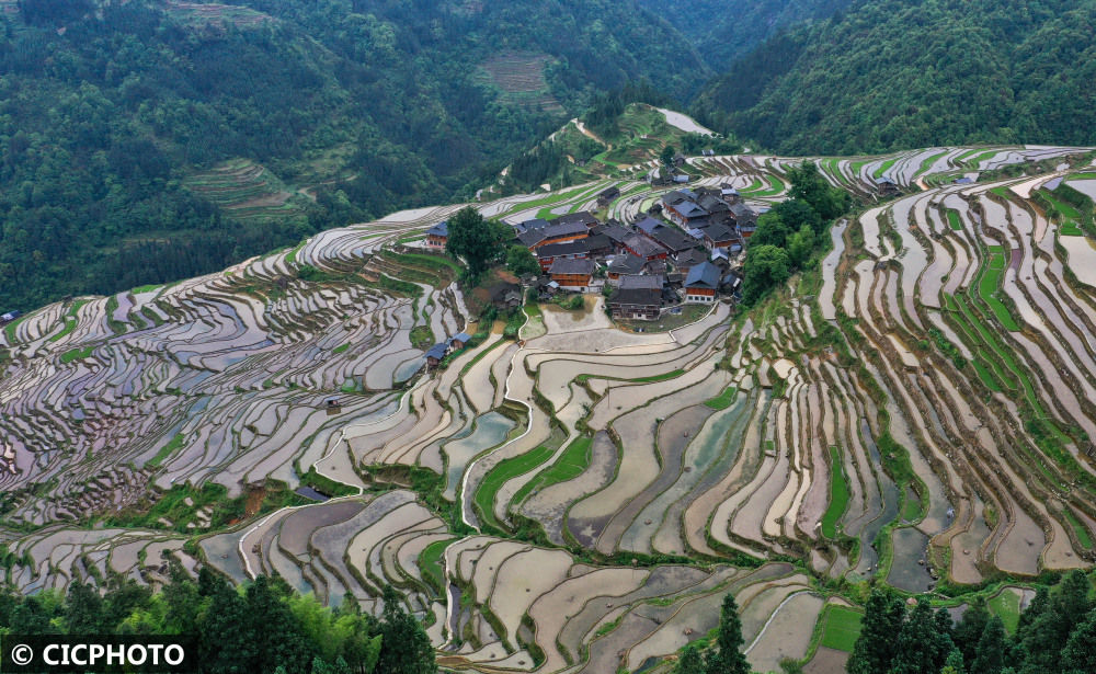 ↑2022年5月10日在贵州省黔东南苗族侗族自治州锦屏县固本乡八一村拍摄的景色。(无人机拍摄)CICPHOTO/杨晓海 摄