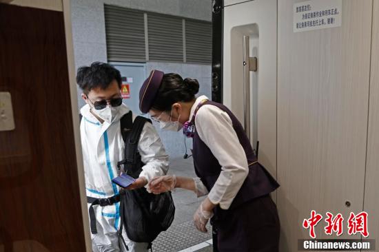 中国铁路上海局集团有限公司上海客运段高铁三车队列车乘务员正在对旅客车票进行查验。