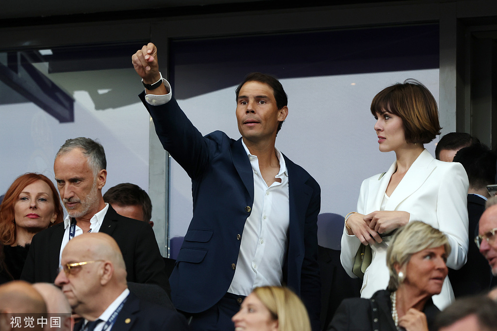 ↑正在参加法网的纳达尔来到球场,为皇马加油。