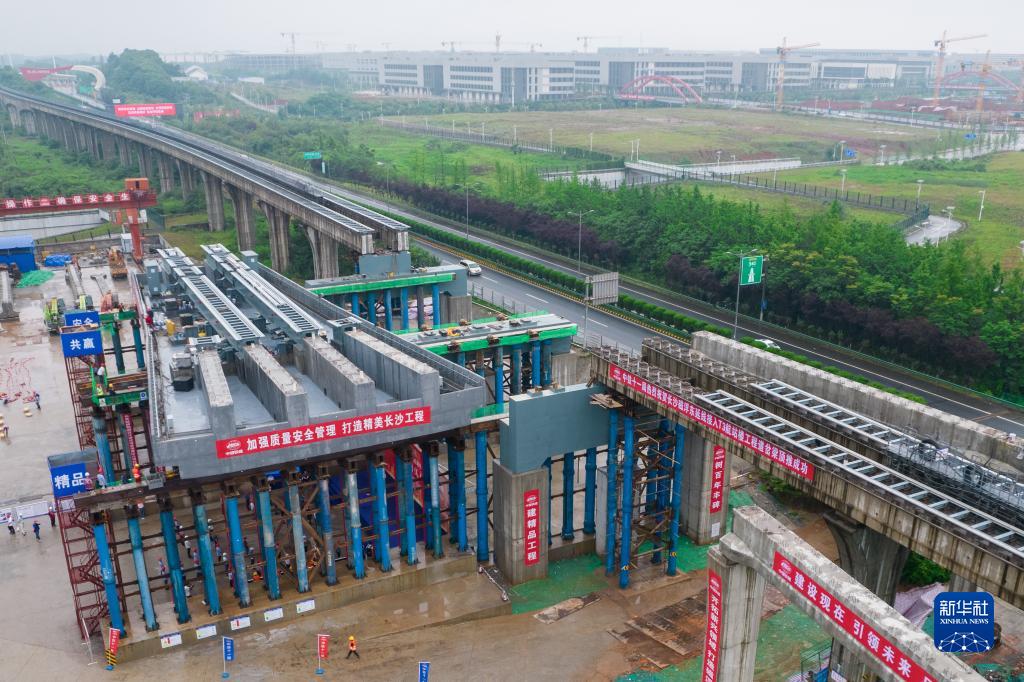 当日,由中铁十一局集团承建的长沙磁浮东延线接入T3航站楼工程道岔梁顶推施工启动,为工程如期建成运营奠定基础。长沙磁浮东延线工程从既有的长沙磁浮快线开岔引出,因改建工程施工涉及既有线停运,研讨后采用了从既有线侧支架上现浇梁体,再将梁体顶推横移到位的方案,将原需三个月的施工时间压缩至两个月内。