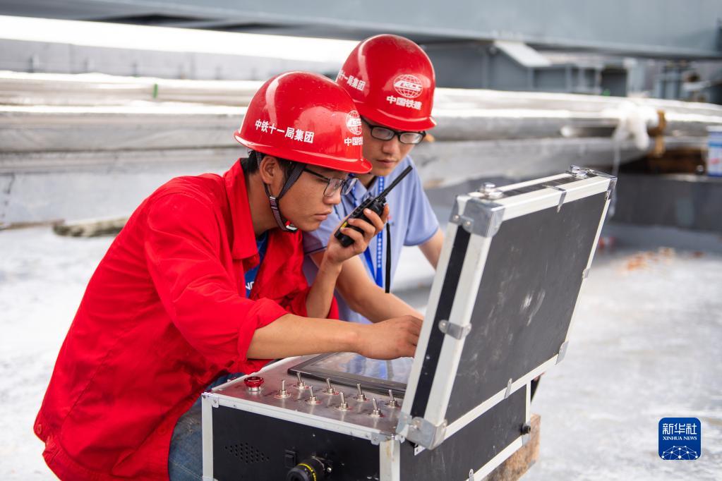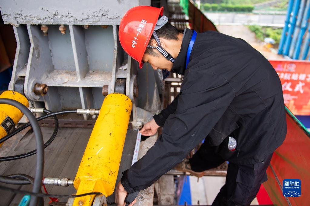 5月29日,在长沙磁浮东延线接入T3航站楼工程道岔梁顶推现场,工作人员测量顶推距离。新华社记者 陈思汗 摄