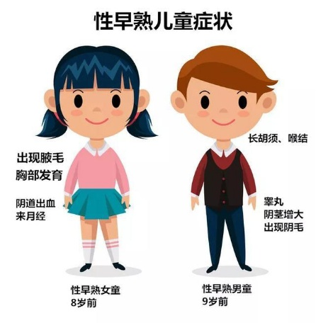 中枢性性早熟是由于下丘脑垂体性腺轴过早启动所致,患儿体内的性激素分泌量明显增多,性腺也会提前发育。除了会有明显的第二性征之外,性器官也随之发育。在大量性激素的刺激之下,骨骼会过度生长,造成骨龄超前。若不及时进行干预处理,骨骺线会过早闭合,成年后身高偏矮。