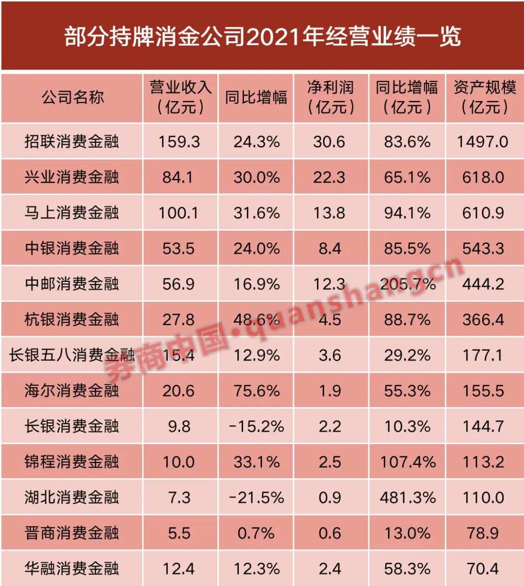 紧随其后的兴业消费金融、马上消费金融资产规模均在600亿元以上。两家公司去年分别实现营业收入84.1亿元、100.1亿元,同比增幅在30%左右;分别实现净利润22.3亿元、13.8亿元,同比增幅分别为65%、94%。