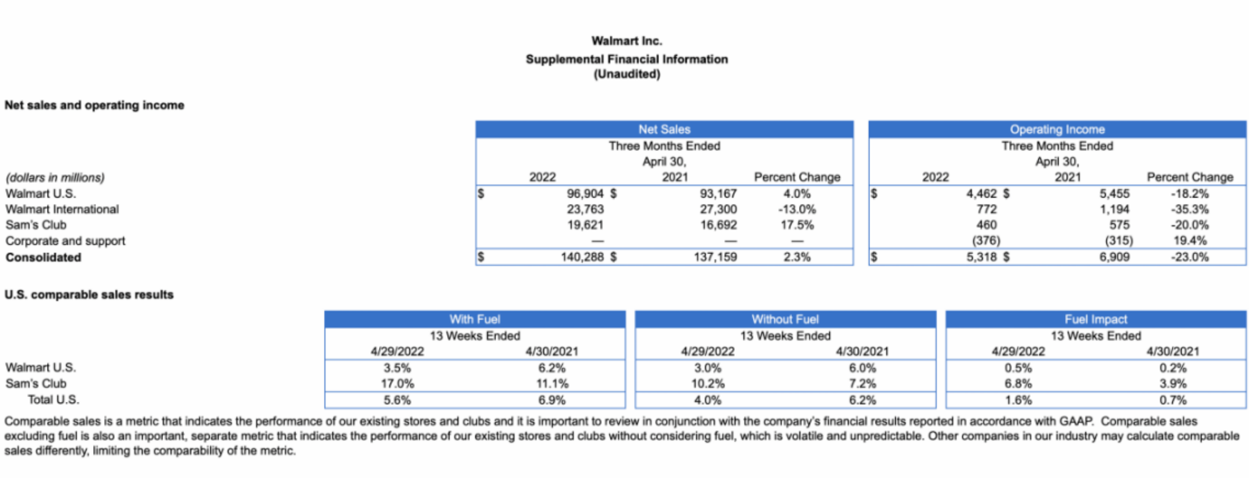 其中销售额增加主要是因为交易增长以及通货膨胀;而经营利润减少则是主要因为燃料和履约在内的供应链成本提高,以及商品降价幅度高于预期。