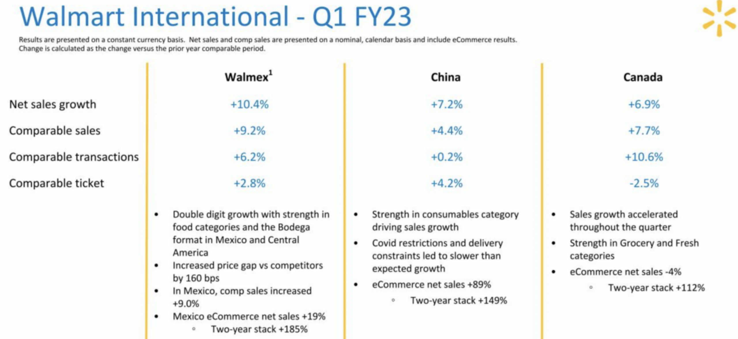 具体来看,2022年第一季度,沃尔玛在中国市场的销售额增速是“沃尔玛国际”现有市场中增速最慢,同店交易增速只有0.2%;这远低于“墨西哥及中美洲国家”的6.2%,以及加拿大的10.6%。