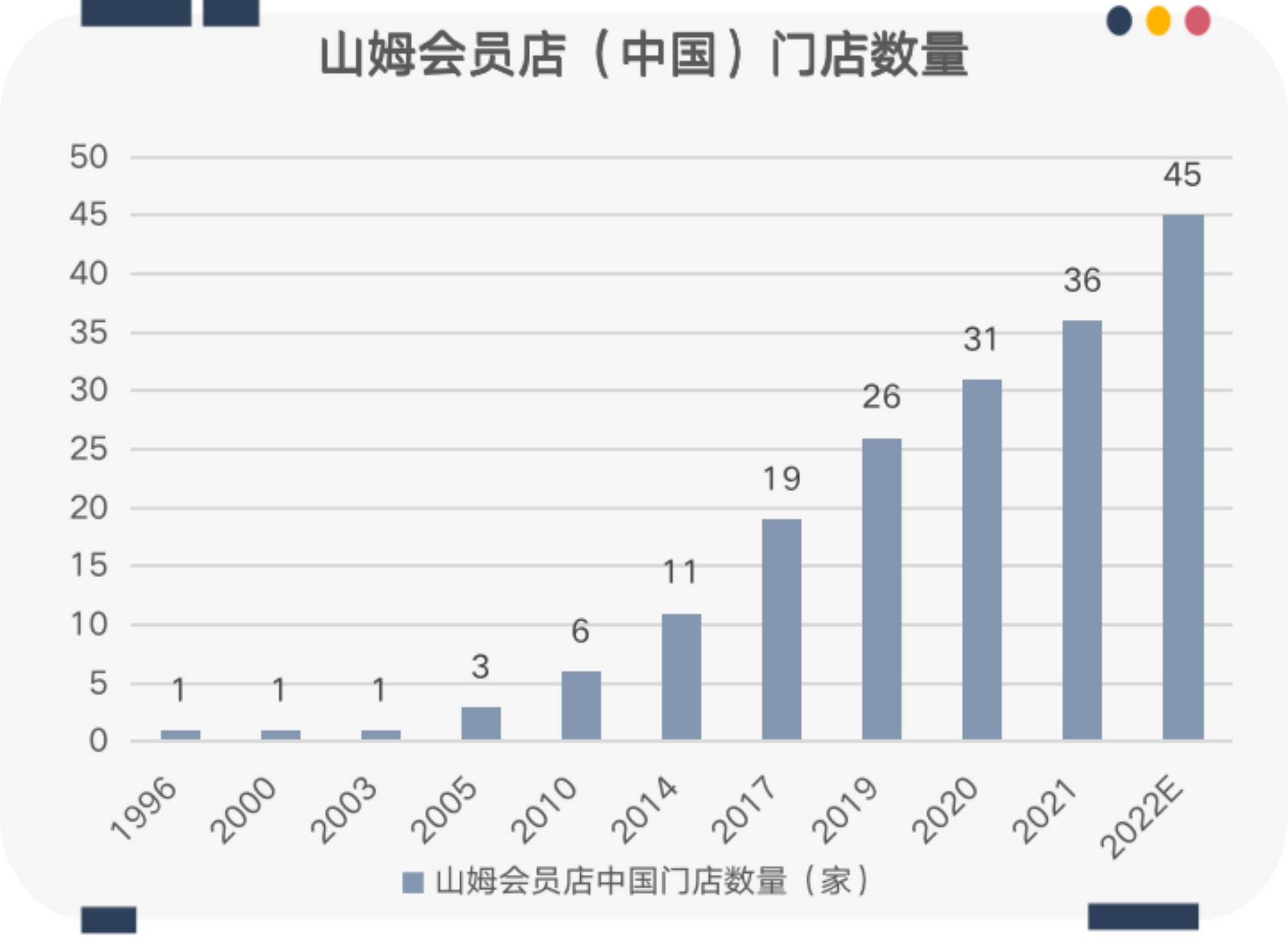 截至2021年末,沃尔玛在中国的22个城市开了36家山姆会员店,会员数高达400万人。2022年,沃尔玛还计划将山姆会员店增加至40至45家。