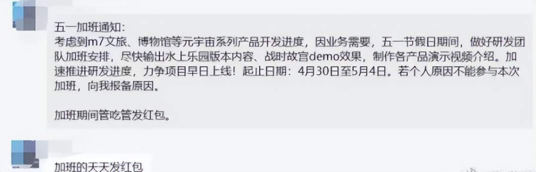 聊天记录显示,因业务需要,李瑞杰要求研发团队在“五一”假期加班,并表示“加班期间管吃管发红包”。另外的一则聊天记录显示,李瑞杰要求“五一全部加班”、“不服的,马上炒掉”。