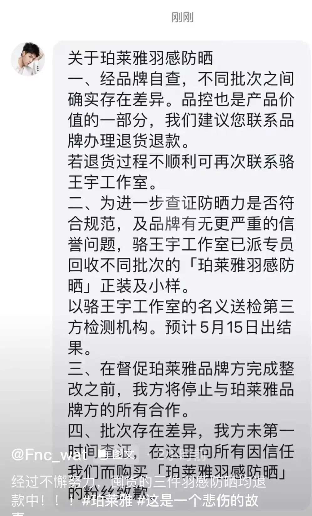 28日晚,珀莱雅事件一经发酵后,骆王宇已第一时间声明“在督促珀莱雅品牌方完成整改之前,我方将停止与珀莱雅品牌方的所有合作。”