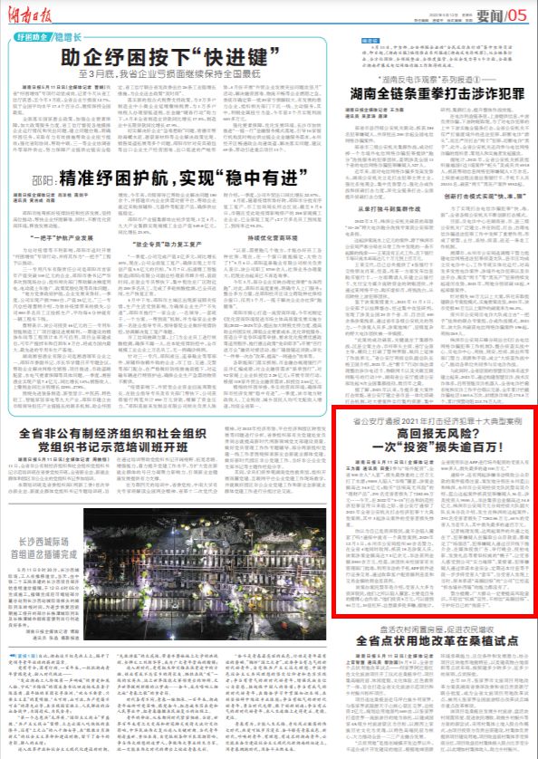 湖南日报5月11日讯(全媒体记者 王为薇)参与“场外配资”,全省500余人“入套”,损失最惨重的上百万元打了水漂;9000人陷入“非吸”圈套,涉案金额高达34.8亿元;购买“回报高无风险”的“理财产品”,291名受害者损失了7282.86万元……今天,在2022年“5.15”打击和防范经济犯罪宣传日来临之际,省公安厅通报了2021年全省公安机关打击经济犯罪十大典型案例,其中3起涉众案件的受害者损失惨重。