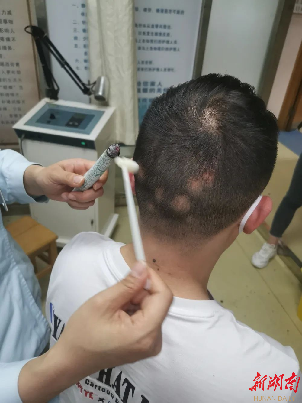 李女士今年1月一天洗澡时,突然摸到头上有一块地方异常光滑,联想到前段时间疯狂掉头发,立即跑到镜子前查看,扒拉出一块硬币大小的秃皮,她的心一沉,自己才30岁,怎么就秃了,别人告诉她这是“鬼剃头”,自此后,李女士非常焦虑,连门都不敢出。后来,李女士鼓起勇气来到岳阳市中医医院脱发门诊。接诊医生告诉她,这个病和精神压力有关,中医有独特疗效,目前首要的是放松心情。随后经过详细问诊后李女士诊断为“斑秃”,中医辨证属肝肾不足型,医生开出治斑秃的中药方,水煎服,并结合梅花针、艾灸、生发酊三联疗法。治疗15天后,李女士脱发区开始出现明显绒毛生长,3个月之后,头发生长浓密,恢复如初。