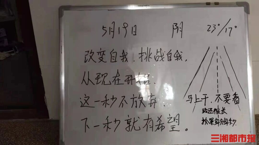 “千万别对自己说不可能,你想要能就一定能”“改变自己,从现在开始”……进入高考倒计时,长沙市明达中学49岁的宿管阿姨黄亮,每天都会在宿舍楼进门最显眼的地方摆上一块写字板,上面是她精心挑选的励志语录和可爱的手绘,至今已有53篇。字迹不算优美,却满满都是质朴的关心和爱。