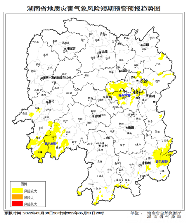 三湘都市报·新湖南客户端5月30日讯(全媒体记者 李成辉)根据地质灾害成灾规律和孕灾条件,结合2022年5月30日短期气象预报情况,省自然资源厅与省气象局联合会商得出如下结论:自5月30日20:00至31日20:00,受降雨影响,湘东、湘西南、湘南部分区域发生突发性地质灾害风险较大(黄色预警)。