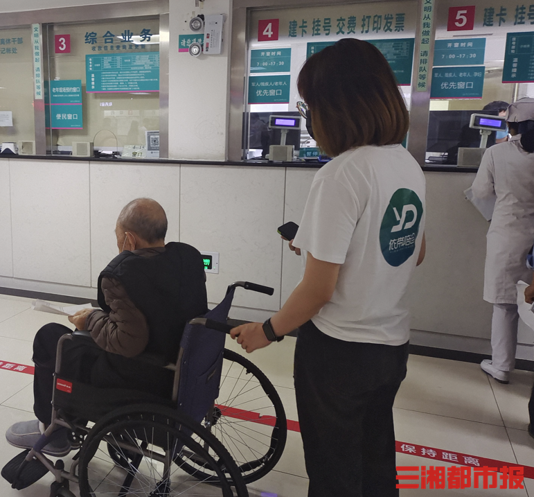 “老人患有风湿、行动不便,特地从安化来的,子女身在外地回不来,所以委托我们陪诊。”4月28日下午,陪诊员谭婷在长沙某三甲医院入口处与客户吴女士碰面。