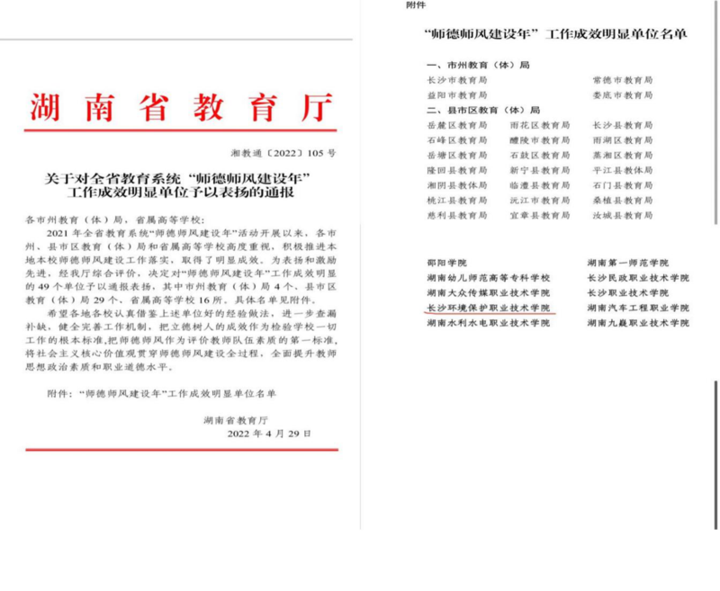 近日,从省教育厅传来消息,长沙环境保护职业技术学院荣获“全省教育系统‘师德师风建设年’工作成效明显单位”通报表扬。这份荣誉是对长沙环保职院历来高度重视师德师风建设工作的肯定,更是“立德树人”理念下“润己泽人”内涵文化的彰显。