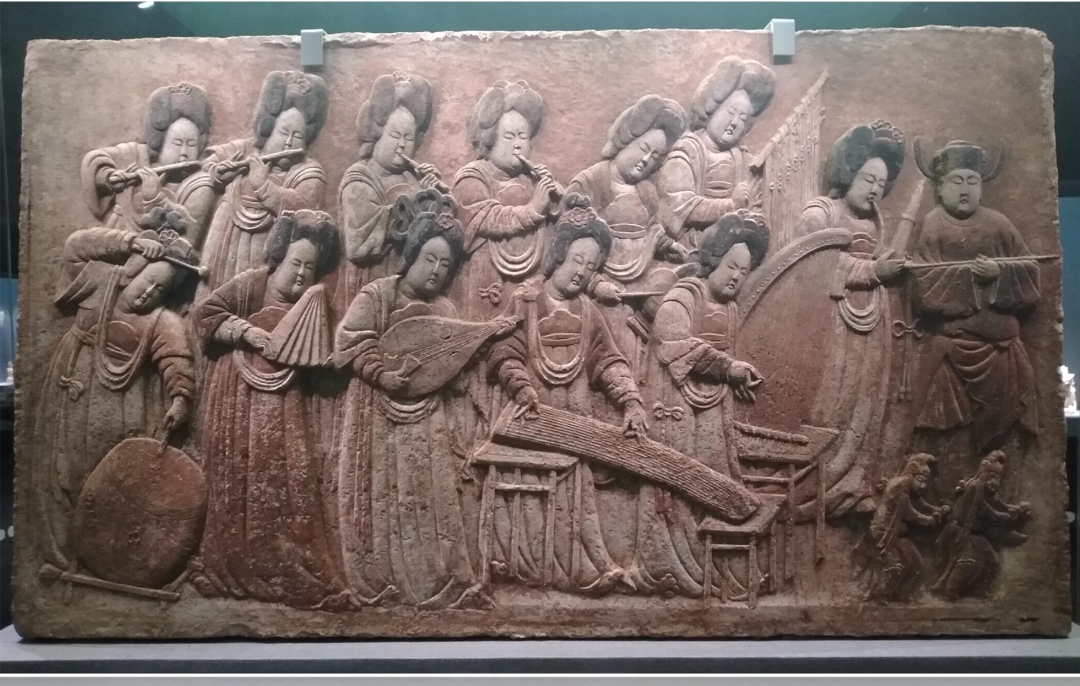 据悉,真实的彩绘散乐浮雕于1994年在河北省曲阳县被发现,自唐代便名震天下的曲阳石雕再一次轰动了世界,次年考古工作者对彩绘散乐浮雕进行了抢救性发掘,目前是河北博物院的镇馆之宝。浮雕以汉白玉石精雕细刻而成,长136厘米、高82厘米,技法圆润细腻,纹饰流畅洒脱。画面中的乐器,有箜篌、筝、琵琶、拍板、大鼓、羯鼓、笙、方响、筚篥、横笛等10种古乐器,弹拨乐、吹管类、打击乐同时出现在1000多年前的石雕上。浮雕之上,两名舞者引路在前,十二名乐伎在女官带领下奏响了千年唐乐。