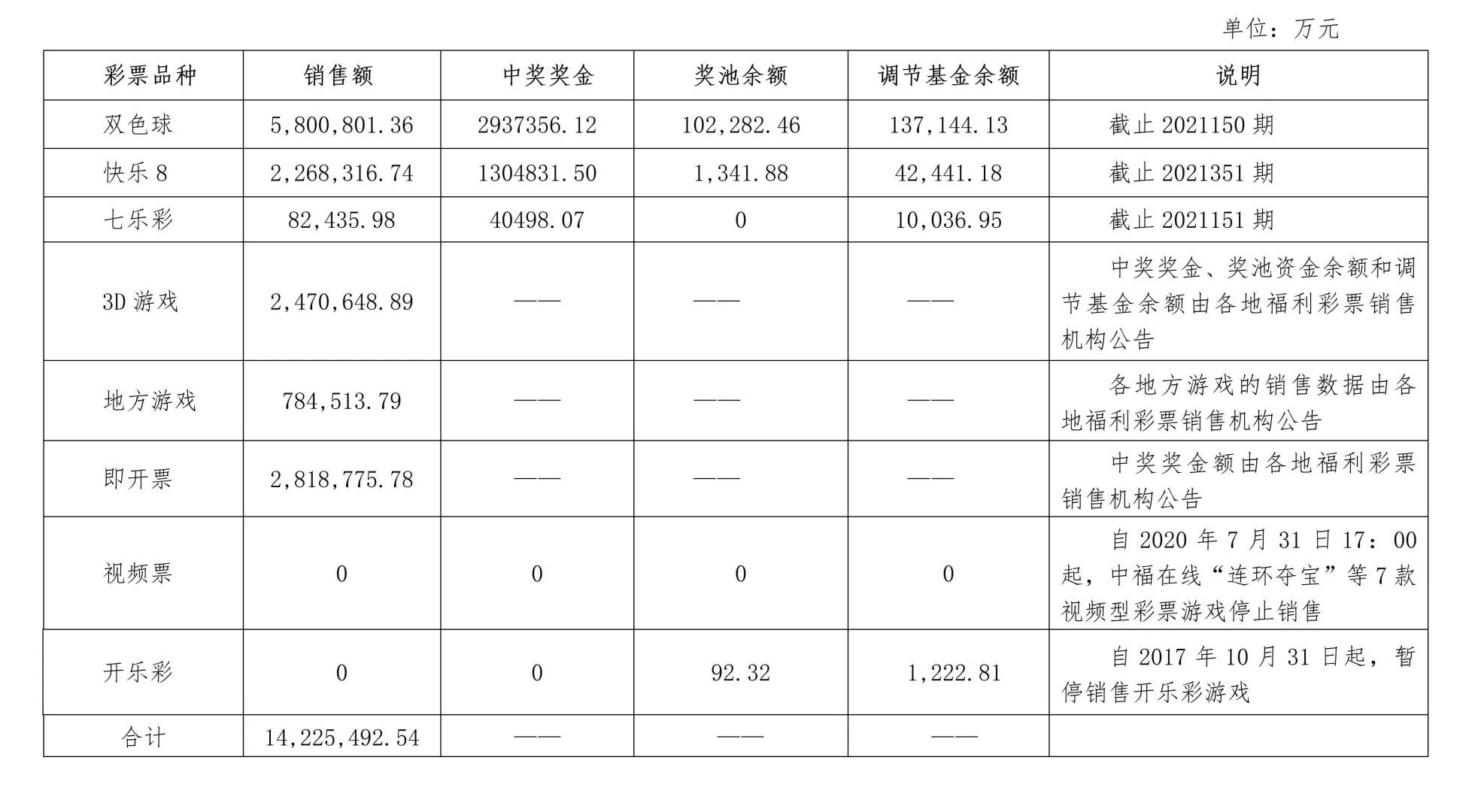 中国福利彩票2021年发行销售有关情况公告
