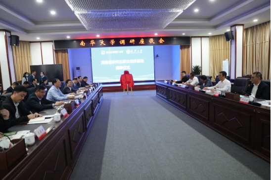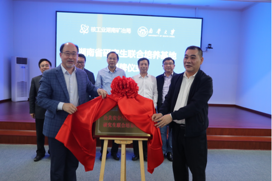 会后,双方举行了核工业湖南矿冶局和南华大学合作共建湖南省研究生联合培养基地的揭牌仪式。核工业湖南矿冶局副局长姚泽军和王福俤副校长共同为基地揭牌,高山、肖启斌、于川江、陈国民、于涛见证仪式。