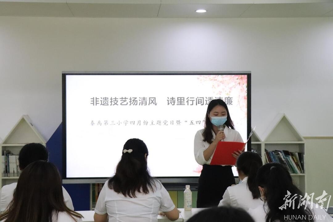 新湖南客户端5月2日讯(通讯员 彭微漪)为将清廉文化建设与校园文化、师德教育相结合,使清廉文化深入人心、清廉理念浸润师生,4月28日,雨花区泰禹第三小学开展了“非遗技艺扬清风诗里行间透清廉”清廉教育暨四月主题党日活动。