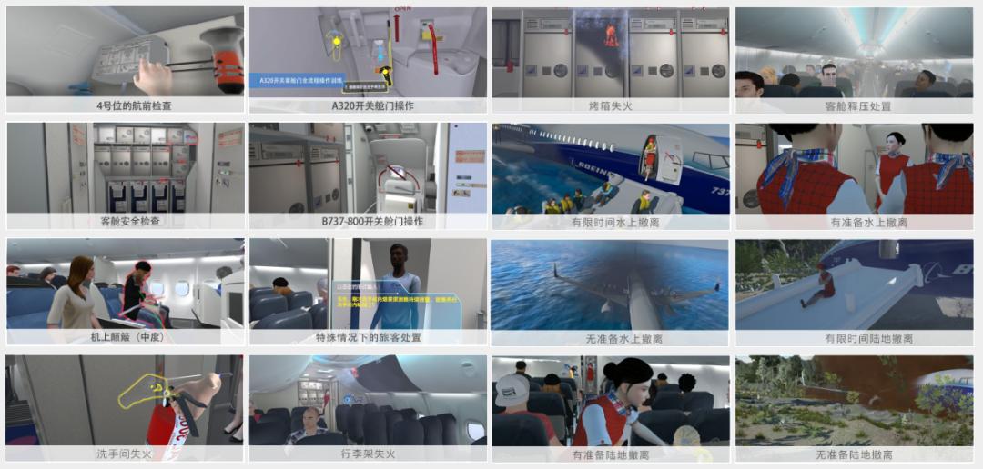 该系统共有16个实训课程,运用VR虛拟现实技术完全虚拟空乘岗位的工作任务和职业环境,包括4号位的航前检查、客舱安全检查、机上颠簸、特殊情况下的旅客处置、应急撤离等,让学员通过模拟的方式快速了解并掌握空乘岗位职业技能,探索空乘服务专业虚实结合实践教学新模式,提升教学效率以及降低培训成本,提高学生职业意识和操作技能。