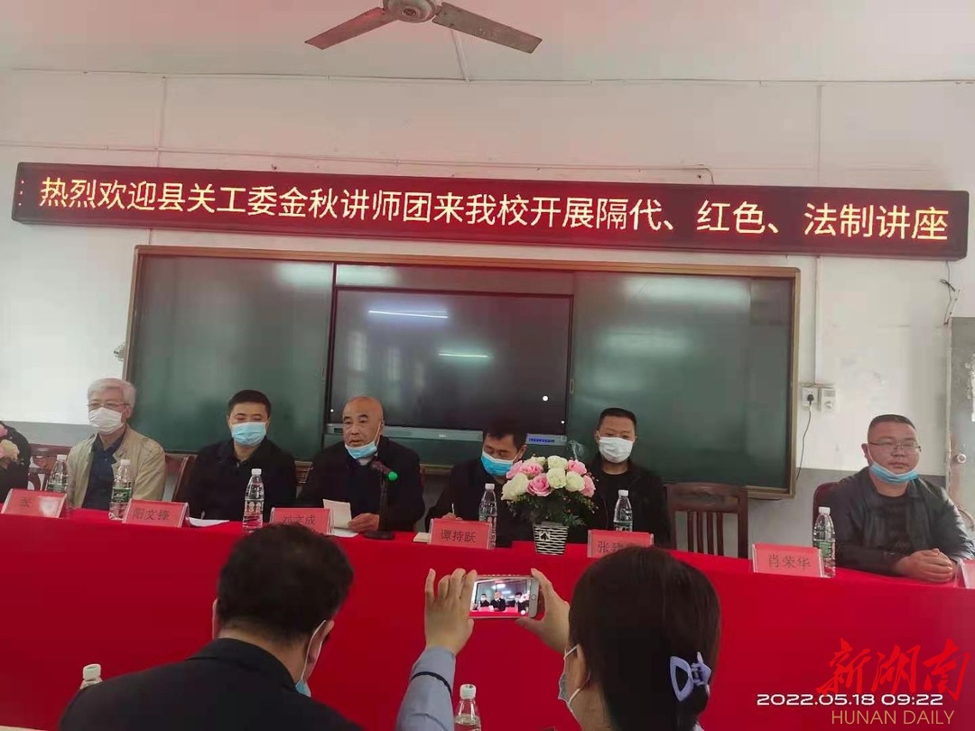 今年以来,为促进下一代更加健康地成长,隆回县关工委特邀请县内退休老干部、老教师、老模范等组成上千人的“金秋讲师团”,做好精美课件,走向各乡镇对从事隔代教育的爷爷奶奶们进行隔代教育,对学生推行红色教育、法制教育,三种特色教育同登台。