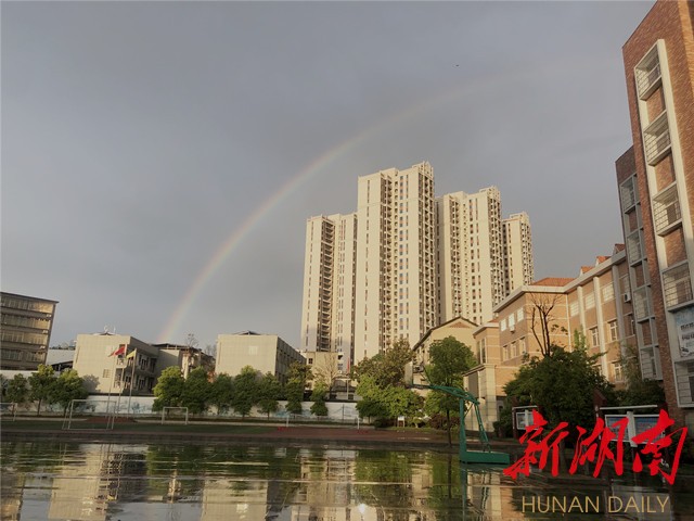 一场大雨如期而至。雨后,炫目的彩虹装扮着天空,又将柔和的色彩洒在校园里。