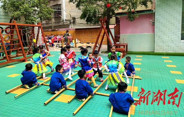 活动当日,全园师生身穿苗服,同吃黑米饭、跳竹竿舞。竹竿舞是苗族同胞庆祝节日的独特方式,以欢快的舞步和有节律的竹竿敲击声共庆美好生活。“啪啪啪”竹竿敲打着,老师在竹竿间飞舞,小宝贝们也迫不及待想加入,听着老师的口号“左右,左右”,欢声笑语充满了整个操场。