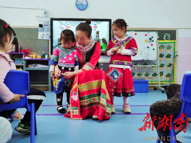 在绥宁县城关幼儿园,各班教师精心准备,引导幼儿认识这欢欣喜悦的节日,感受苗族热闹的节日氛围。通过观看视频《杨黎娘救兄》,孩子们了解了关于“四月八”的民俗传说。