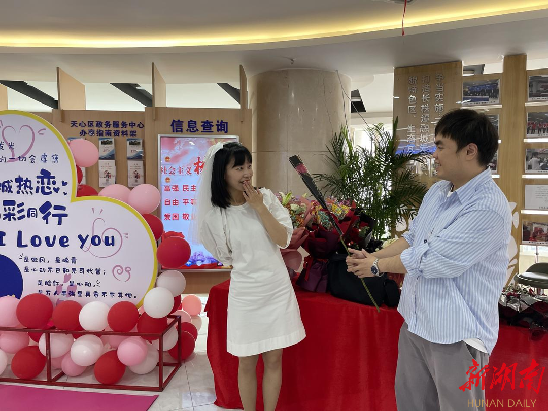 (开福区婚姻登记大厅外,长沙福彩为新人布景)