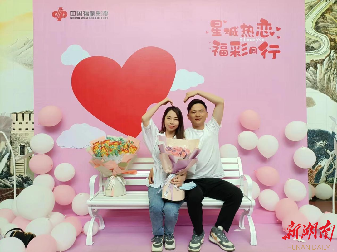 活动还通过展板向新人介绍即开票婚庆主题彩票、福彩快乐8游戏派奖活动以及“沁园春·长沙”本土票,引爆“520”的专属极致浪漫。