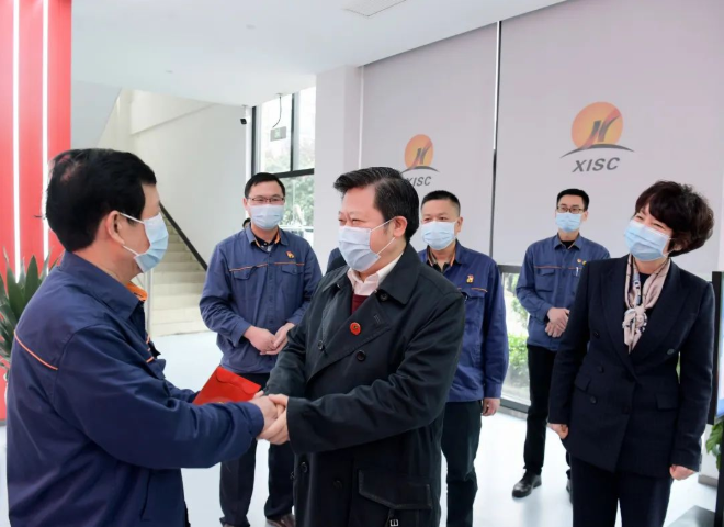 刘志仁一行首先来到湘钢,看望全国劳模艾爱国和张军。在科研大楼,刘志仁现场调研了艾爱国焊接实验室。该实验室是湖南省焊接工艺技术重点实验室,包含工作室和展览馆两部分。其中,工作室以科研、教学和成果展示为主,为新品开发和客户服务提供技术支撑;展览馆是湘钢为弘扬艾爱国劳模精神、工匠精神而设立的功勋人物馆。刘志仁边看边与艾爱国热情交流,感谢他为湘潭树立了品牌、在全国树起标杆,鼓励他持之以恒、不断创新、勇攀高峰,并嘱咐企业深化劳模工作室建设,抓好安全生产。