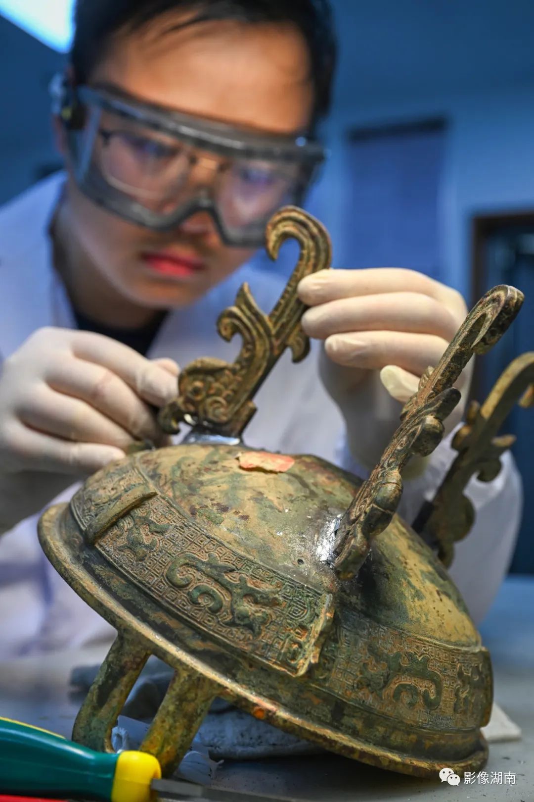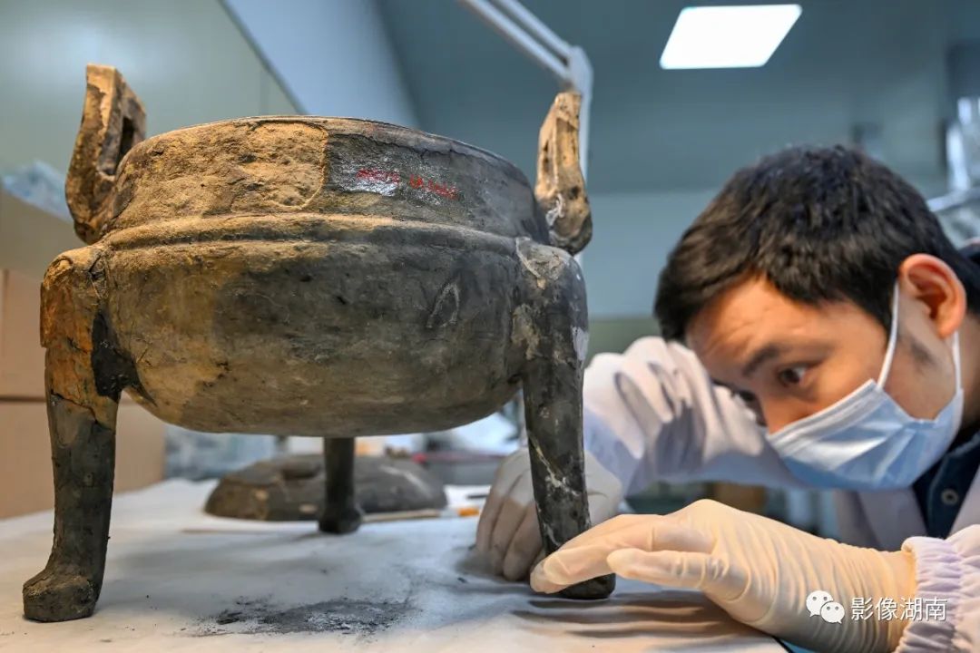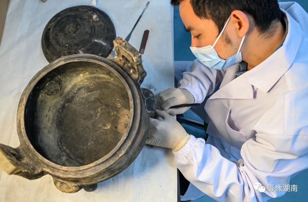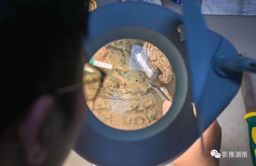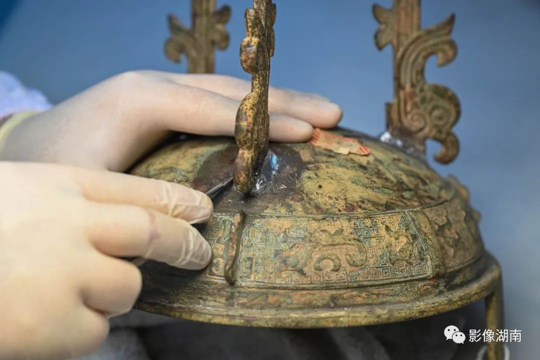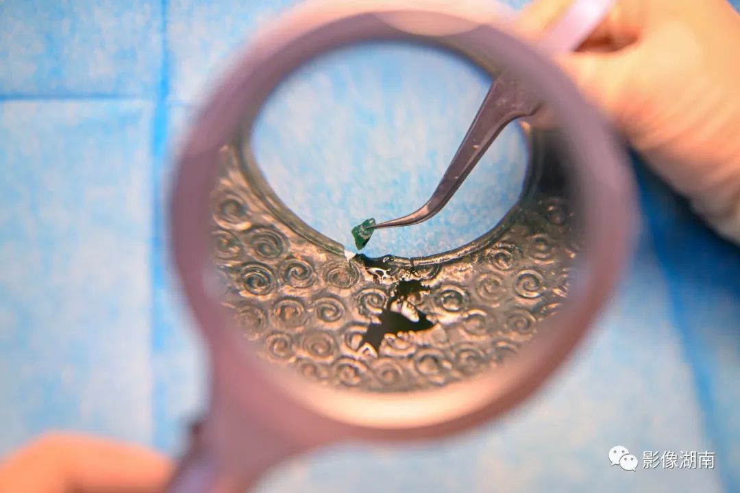 “这个青铜器越式鼎的三个足是用锡焊重新粘接,用锉刀和手术刀等工具一点点打磨修饰,再上锈色。整个做下来,最快也得一个月。”长沙博物馆文物科技保护中心副主任阳帆说。