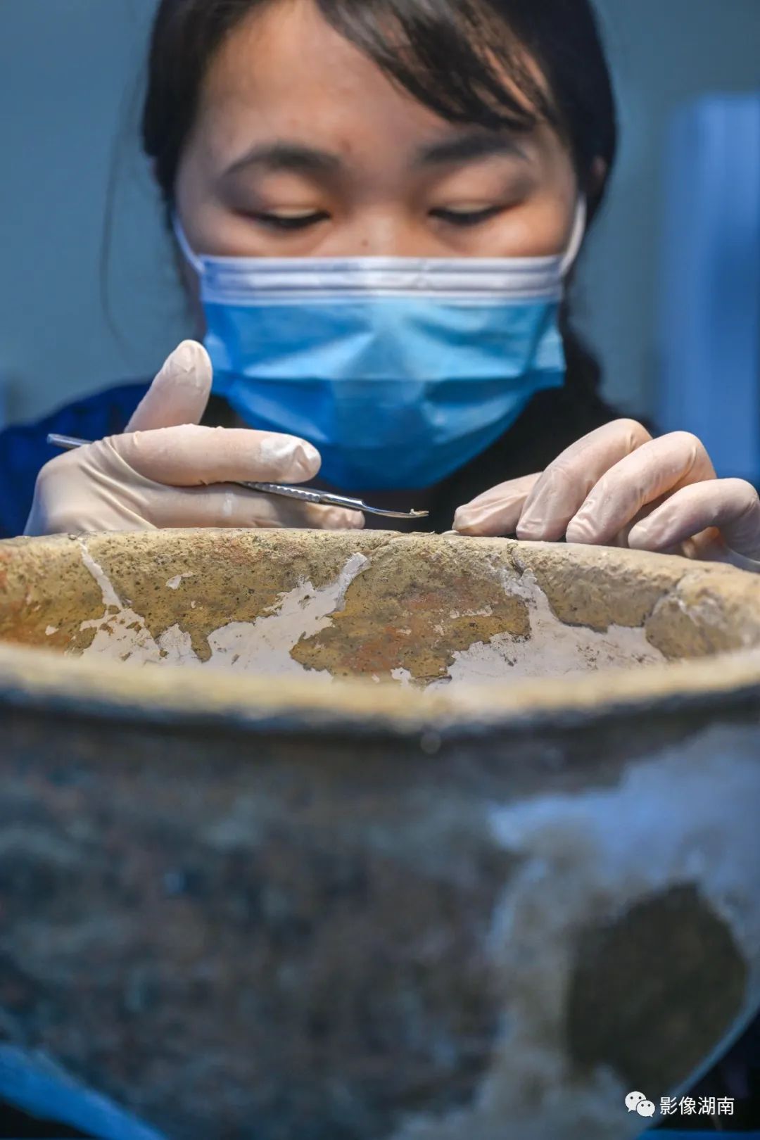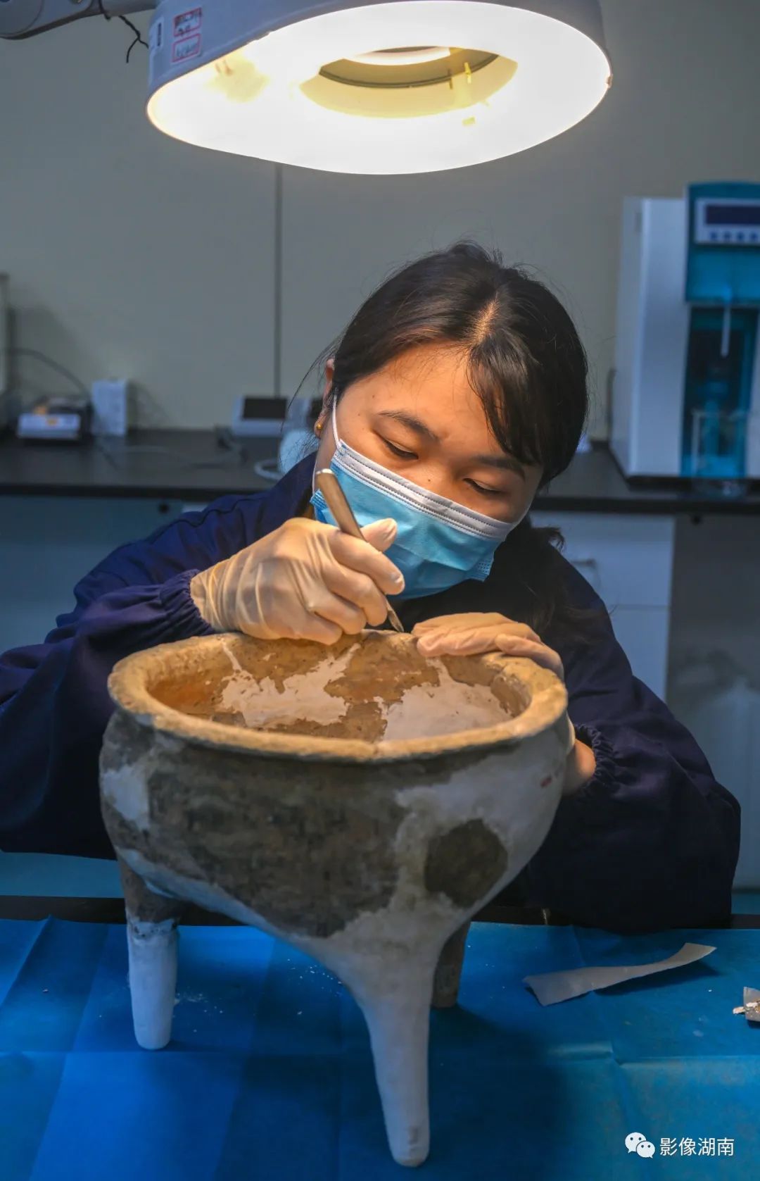 5月12日,长沙博物馆文物科技保护中心金属陶器修复室,文物修复员陈叶在修复战国时期的出土文物陶鬲。