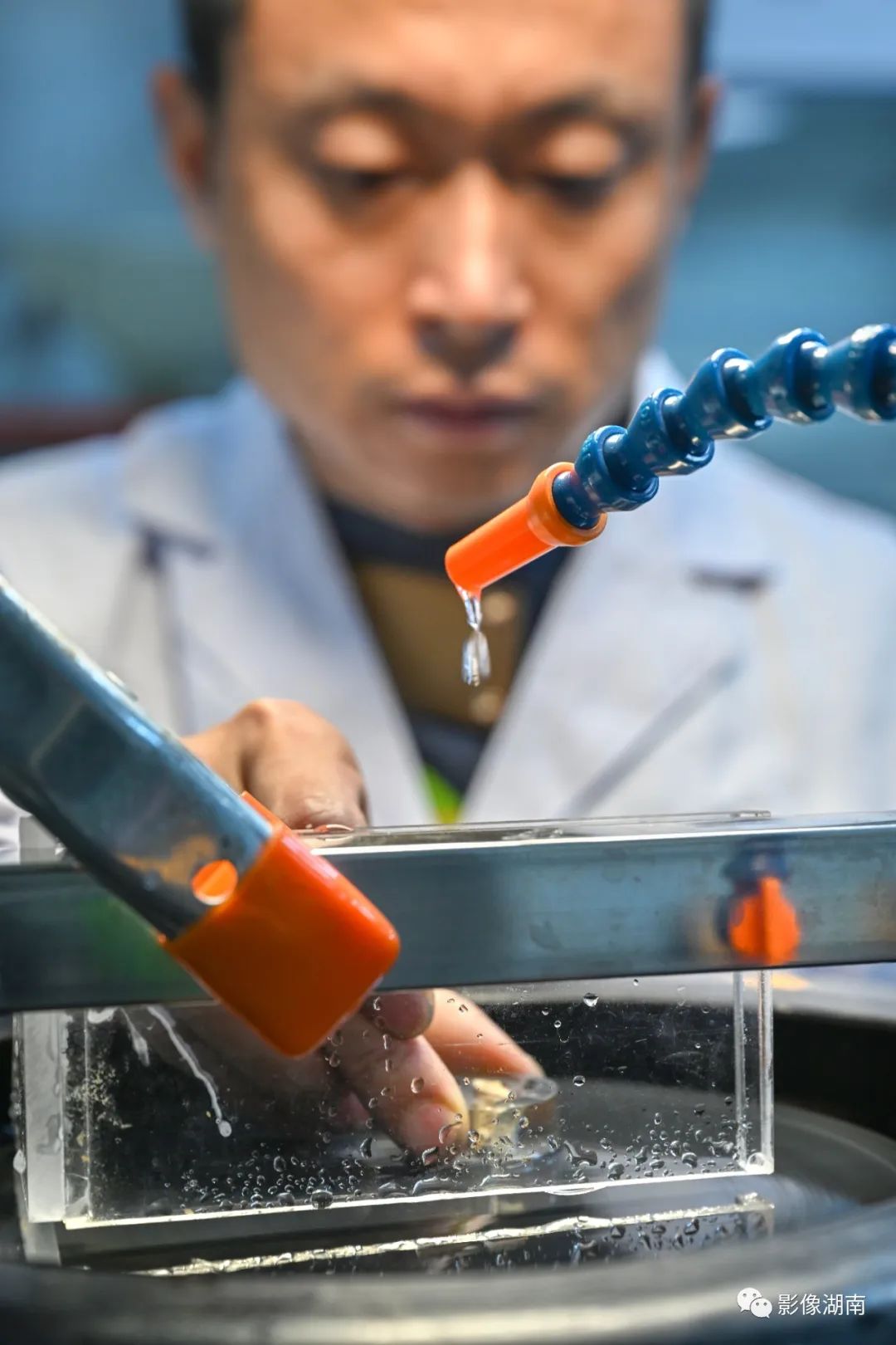 5月12日,长沙博物馆文物科技保护中心金属陶器修复室,文物修复员张兴崇用磨抛机对长沙窑的文物小样品进行打磨,嵌入树脂里文物经过打磨抛光后再做分析检测,观察内部结构研究。