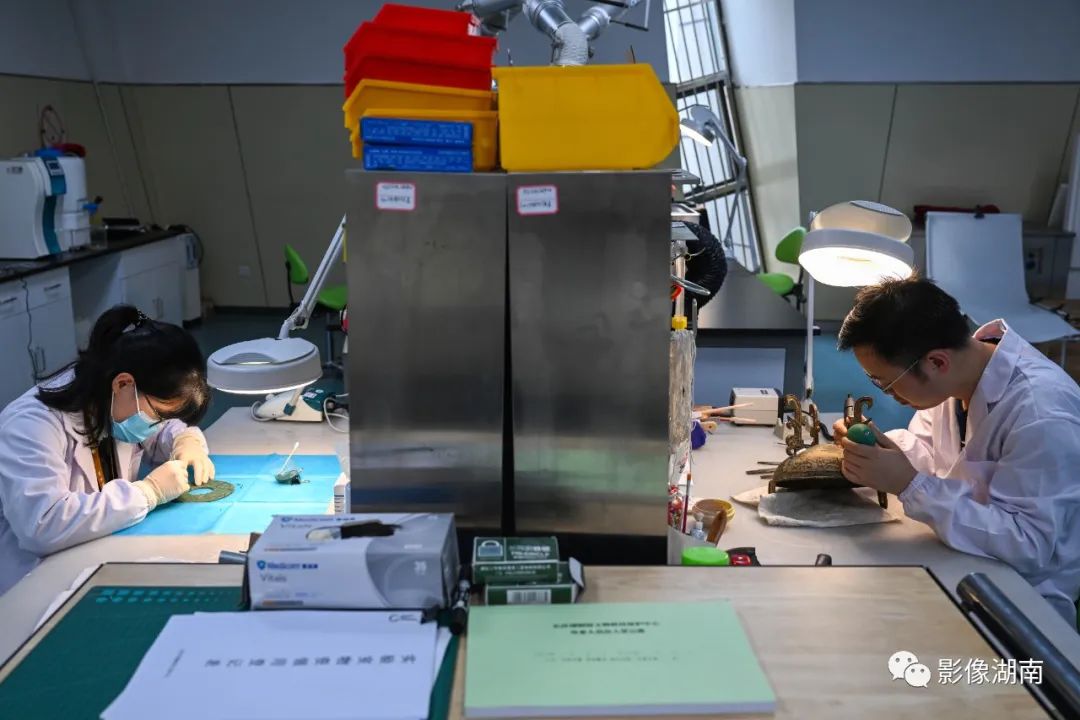 5月12日,长沙博物馆文物科技保护中心金属陶器修复室,文物修复员在认真地修复文物。