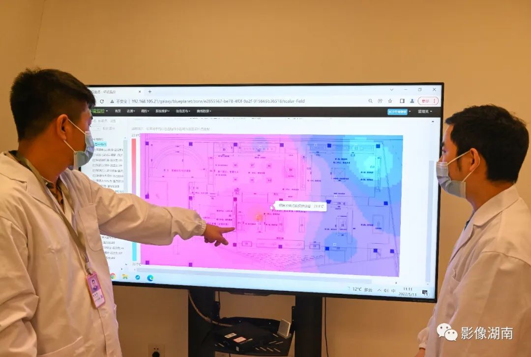 5月13日,长沙博物馆预防性保护监控室,文物科技保护中心的工作人员通过预防性保护监控系统,观察各个展厅的温湿度、二氧化碳、光照度、挥发性有机化合物等在环境监测平台上的实时情况。