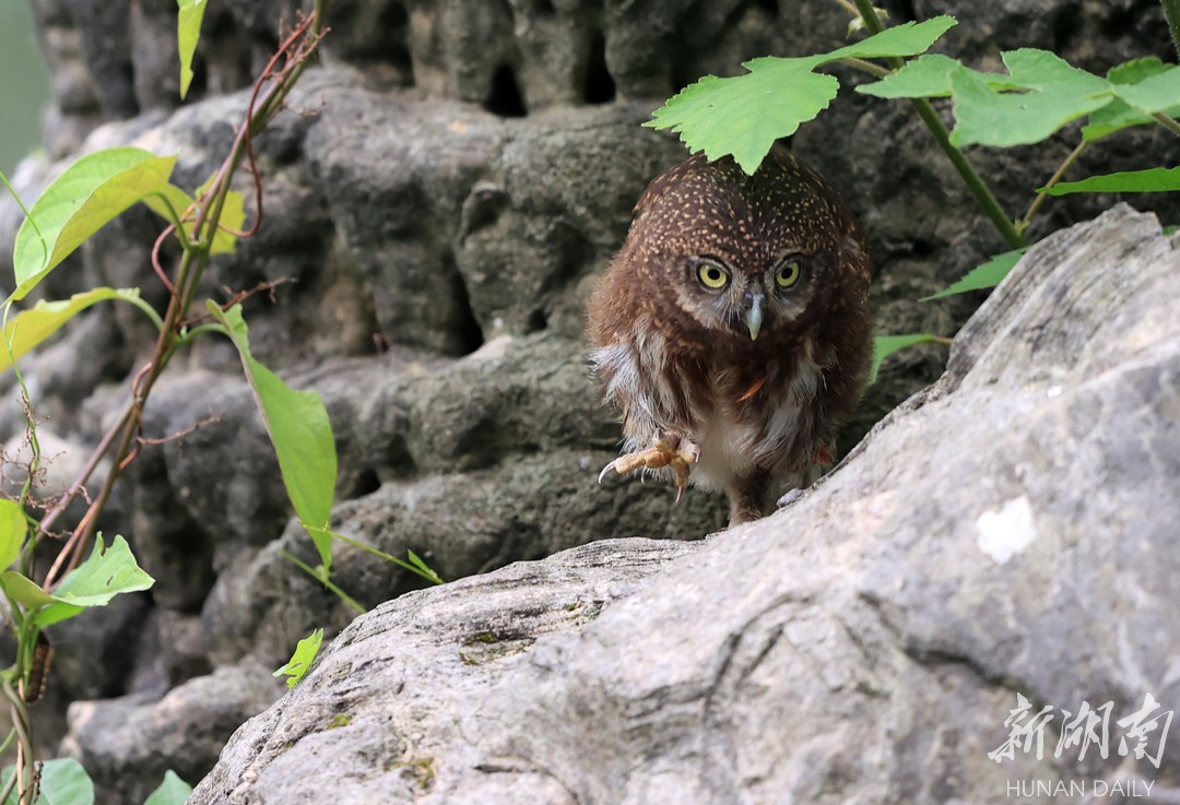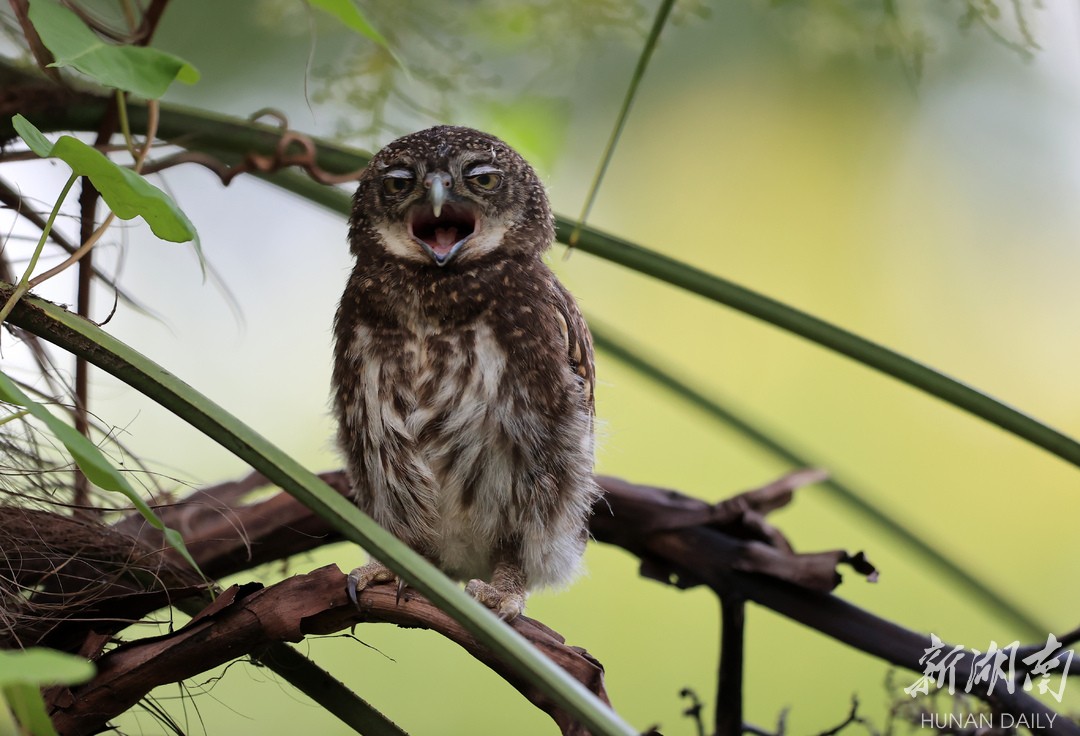 湖南烈士公园,辛劳的斑头鸺鹠(xiū liú)夫妇生育了四只幼崽。5月6日至9日,四个天真可爱的小鸟相继出巢。