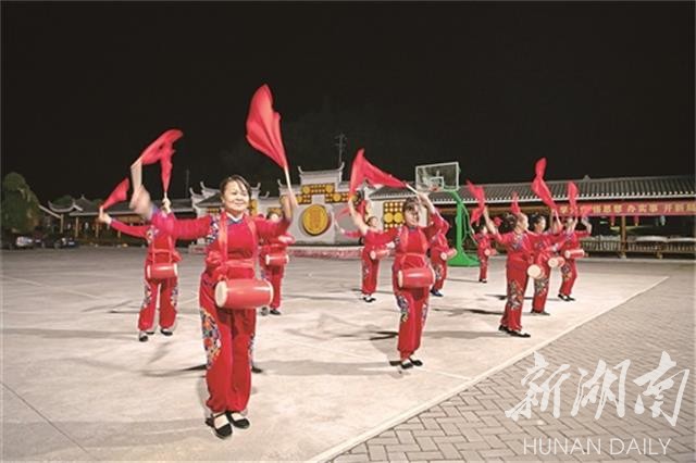 傍晚时分,村部文化广场,三三两两的村民在文化长廊闲聊,村广场舞队的雷晚英和队友们跳起了广场舞。