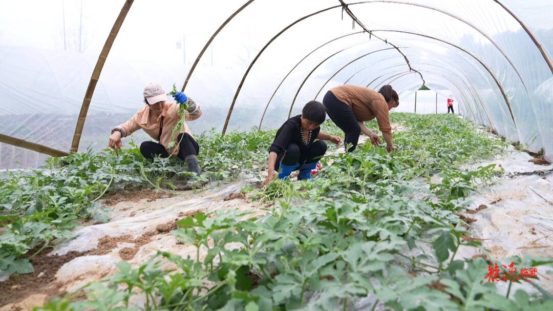 在汾市镇黎坪村大棚西瓜种植基地内,村民们在认真挑选西瓜藤上的雌花进行人工授粉。由于大棚内无蜜蜂,无法自然授粉,一旦雌花过了授粉期就会枯萎。
