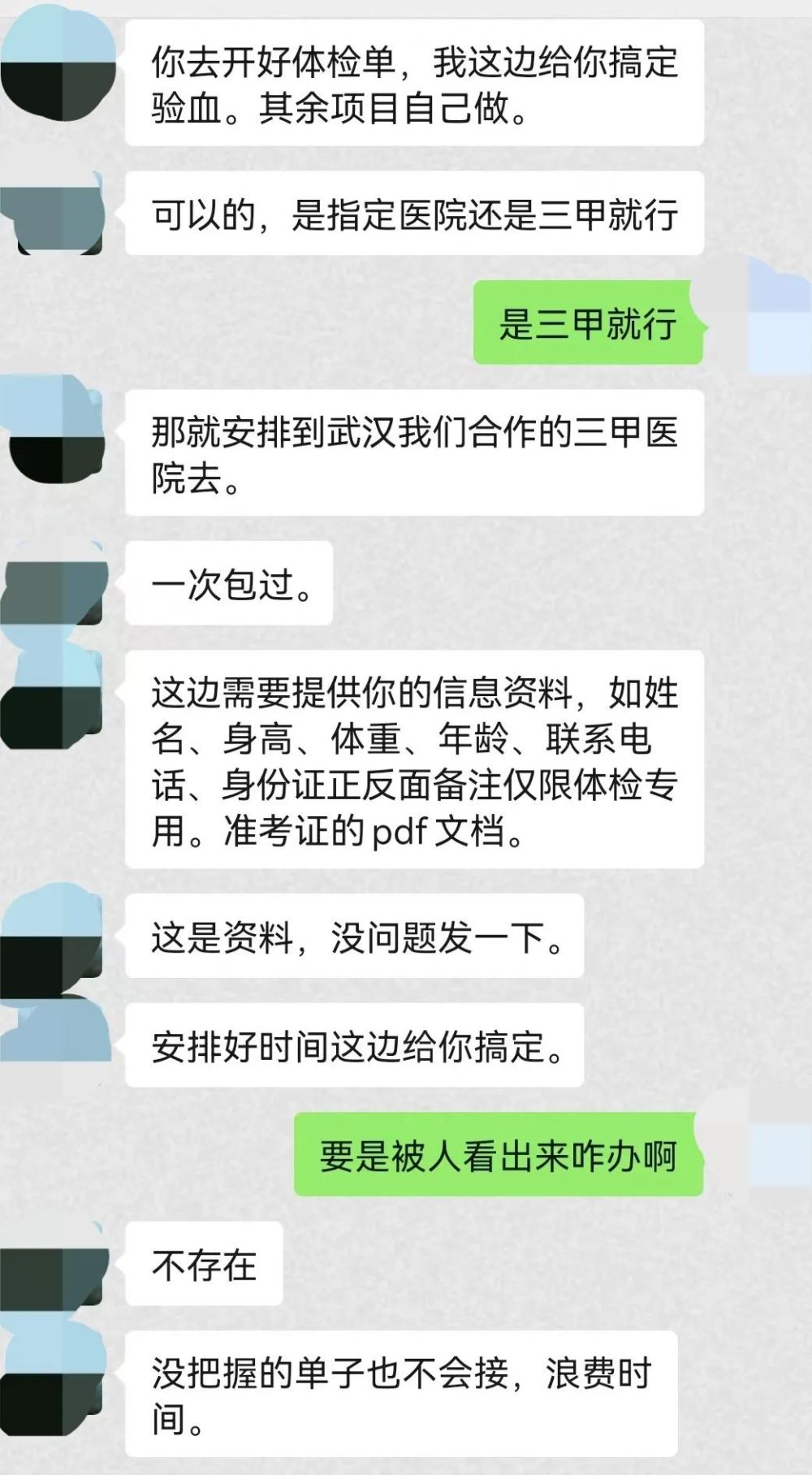 记者随后询问,代检是否会被识破?对方回复说:“我们都做了20来年了,每周都会接很多单,在武汉都做了成千上万次代检了。我们和各个医院都很熟悉,即使是在指定医院体检,或有人事带队,我们也都能帮你体检,百分之百保证代检成功!”客服说。