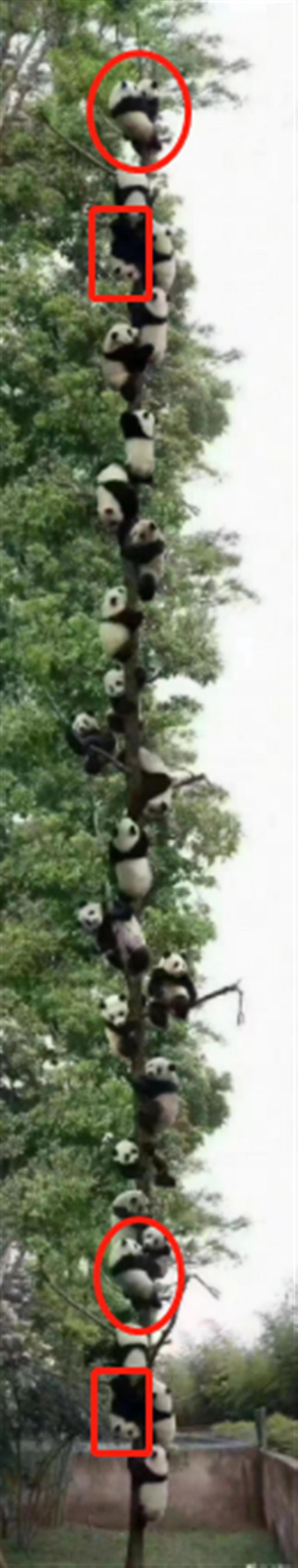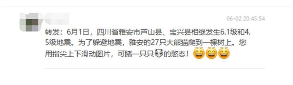 不过,地震发生后,一棵树上密密麻麻爬满大熊猫的图片,在各大微信群及社交平台热传。还有网友附上转发文字称:“为了躲避地震,雅安的27只大熊猫爬到一棵树上。您用指尖上下滑动图片,可睹一只只熊猫的憨态!”