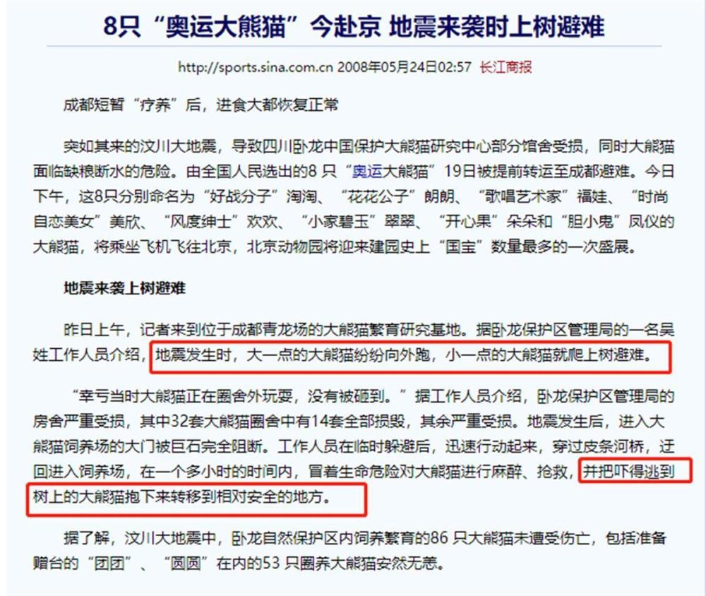 记者梳理公开报道发现,在发生地震时,有的大熊猫受到惊吓,确实会爬到树上躲避。