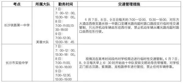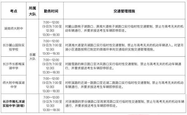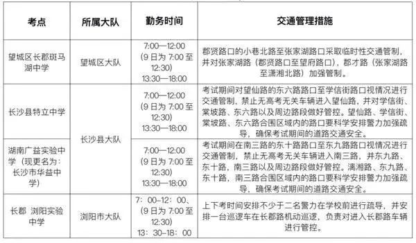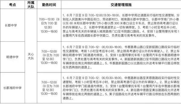 天心区长郡湘府中学:在芙蓉南路中意一路口东口和中意一路新谷路口设立执勤点,根据道路通行实际,禁止与考试无关的车辆进入长郡湘府中学周边,同时在新谷路、果子园路等周边区域路口,根据实际情况进行交通限行、车辆疏导等交通管理措施。