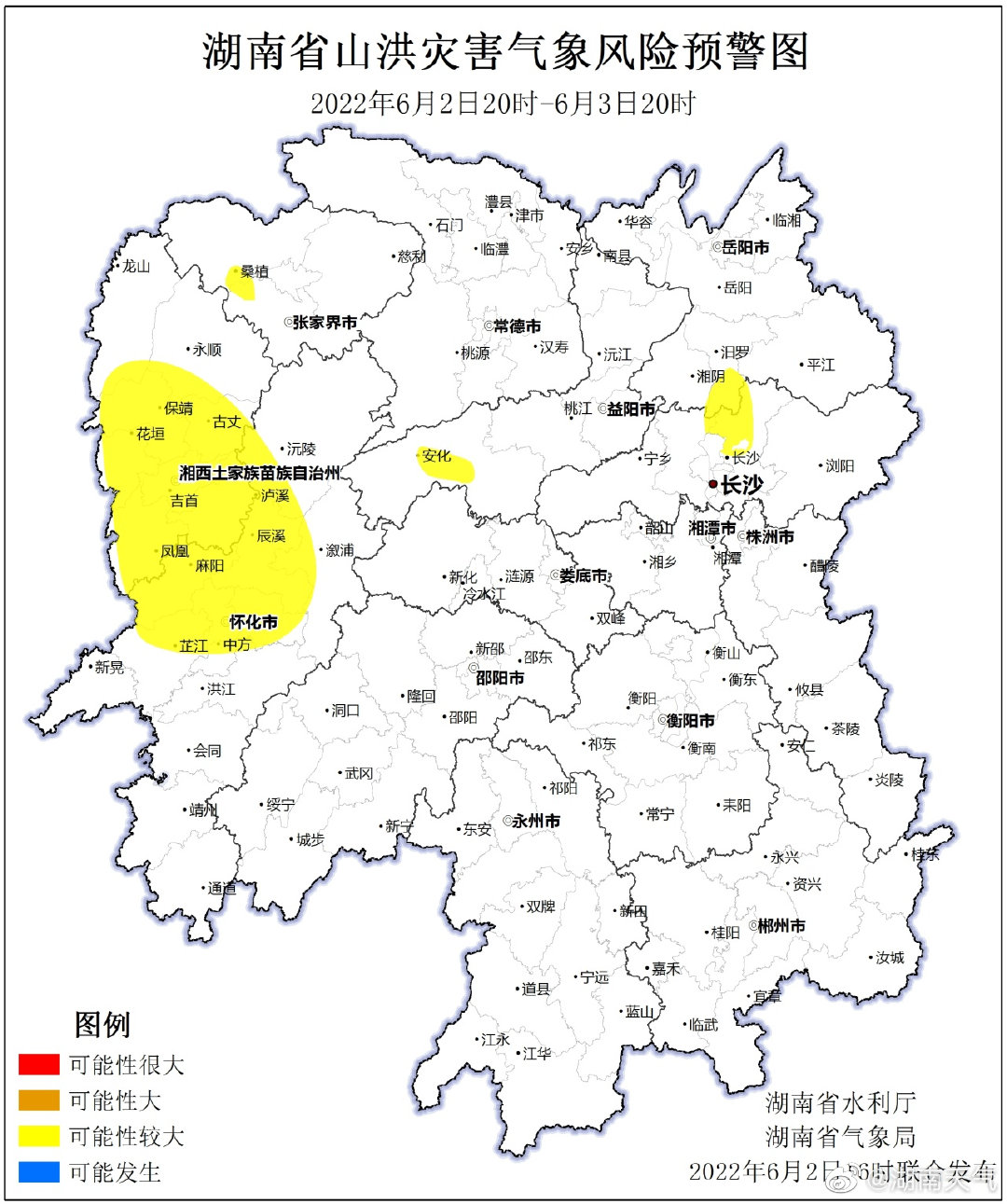 6月2日,湖南省水利厅与湖南省气象局联合发布【湖南省山洪灾害气象风险预警】:预计受降雨影响,2日 20:00至3日 20:00, 张家界市、怀化市、湘西自治州、益阳市、岳阳市、长沙市等局地发生山洪灾害的可能性较大(黄色预警)。