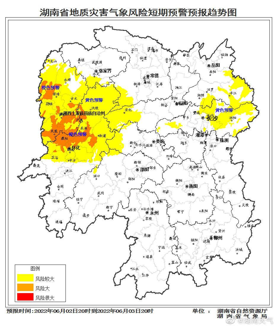 6月2日,湖南省自然资源厅与湖南省气象局联合发布【湖南省地质灾害气象风险预警】:预计自6月2日20:00至3日20:00,受降雨影响, 湘西部分区域发生突发性地质灾害风险大(橙色预警),湘东、湘西大部分区域发生突发性地质灾害风险较大(黄色预警)。